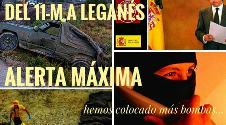 - La farsa de Leganés, con el objetivo de que el Gobierno de Aznar y su Policía se cubran de sangre y de infamia (más todavía), bajo amenazas de volar el AVE si no cooperan. Evidentemente, el Gobierno se presta a esa farsa islamista, pero boicotean el plan al que los obligaban de sacrificar a todos los GEO en un asalto suicida. Muere el GEO Torronteras, pero el Gobierno o la Policía en todo caso intentan que todos sobrevivan, pese a las coacciones recibidas.