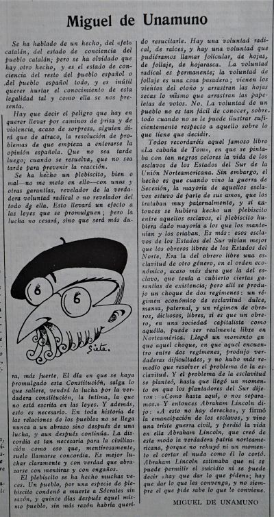 “Se ha hablado de un hecho, del fet catalán, del estado de conciencia del pueblo catalán; pero se ha olvidado otro hecho y es el estado conciencia del resto del pueblo español, o del pueblo español todo, y es inútil querer hurtar el conocimiento de esta legalidad tal y como ella se nos presenta…. Es mejor luchar claramente que abrazarse con mentiras y con engaños. El plebiscito se ha hecho muchas veces… Hay una voluntad radical, de raíces, y hay una voluntad que pudiéramos llamar folicular, de hojas, de follaje, de hojarasca. La voluntad radical es permanente, la del follaje es cosa pasajera. Vienen los vientos de otoño y arrastran las hojas secas lo mismo que arrastran las papeletas de votos. No. La voluntad de un pueblo no es tan fácil de conocer, sobre todo cuando no se le puede ilustrar suficientemente respecto a aquello sobre lo que tiene que decidir”.