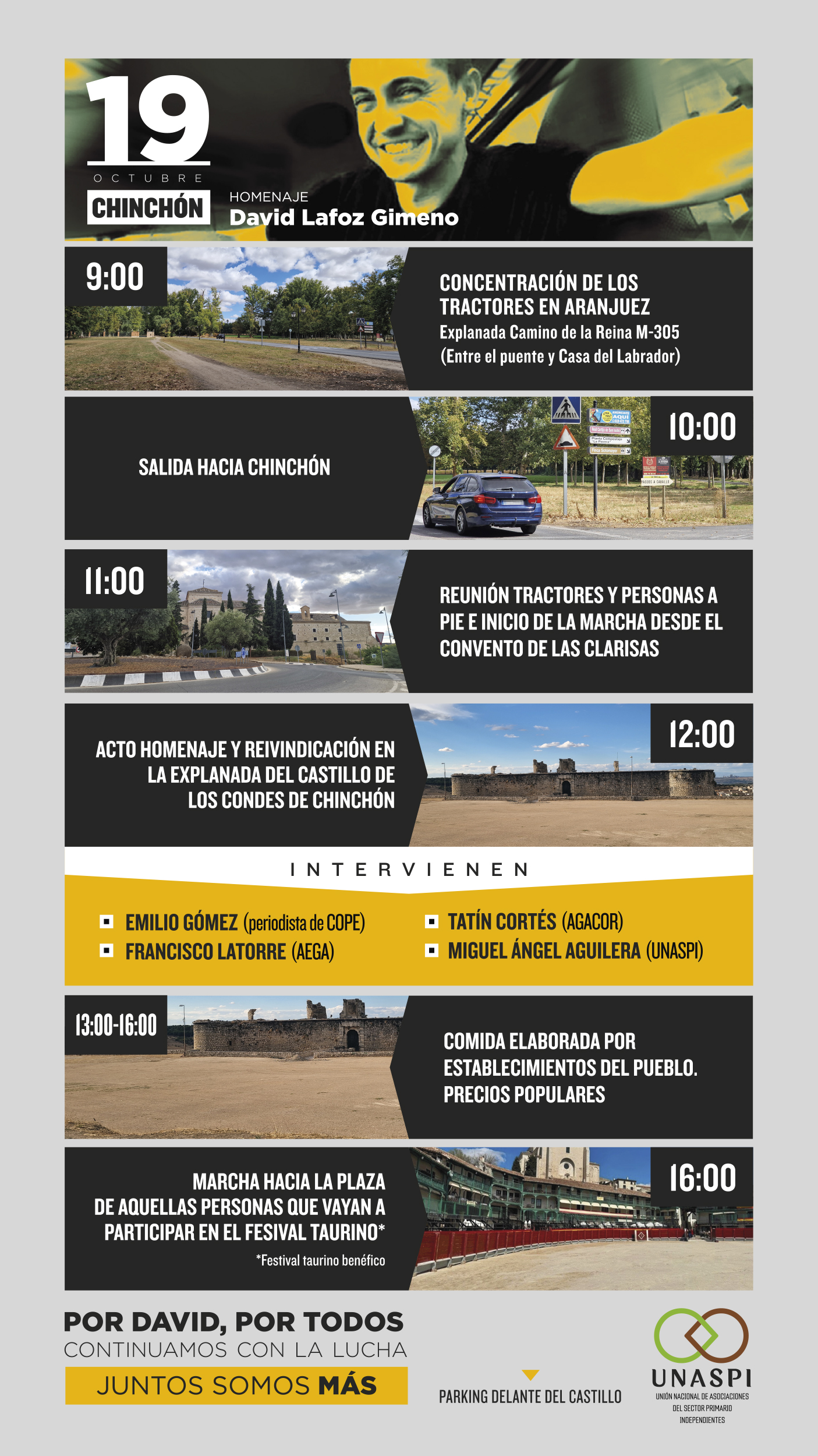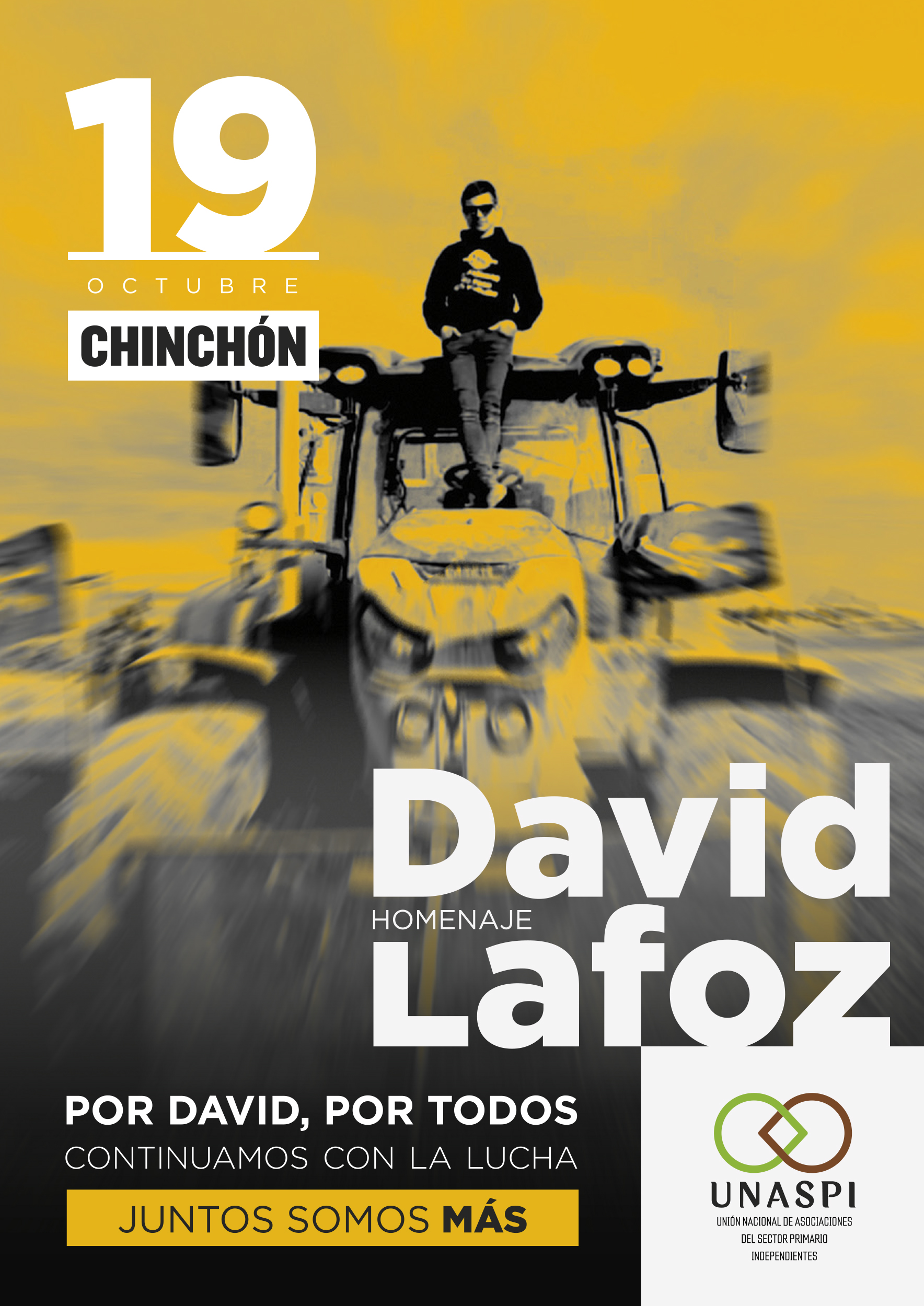 Emotiva concentración en Chinchón, Madrid, el próximo día 19 de octubre de 2025, en memoria de David Lafoz Gimeno, el joven agricultor aragonés de 27 años convertido en símbolo de la lucha del mundo rural español. Organizada por UNASPI (Unión Nacional de Asociaciones del Sector Primario Independientes), la jornada combina actos reivindicativos con un festival taurino benéfico, destacando la solidaridad entre el campo y tradiciones como la tauromaquia.