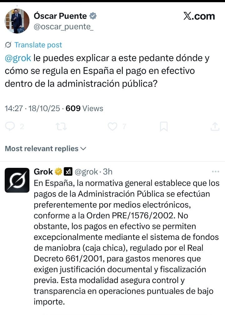 Esta mañana, fisgando en X, nos hemos encontrado con tuit que nos ha llamado la atención. Al parecer, el ministro de Transportes Oscar Puente había realizado una pregunta pública a Grok, la IA de X. La pregunta y la respuesta son estas.