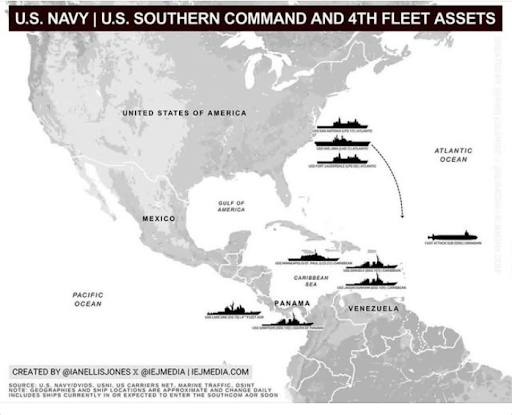 La administración Trump desplegó al menos 8 buques de guerra, 1 submarino nuclear de ataque rápido, y más de 4.500 soldados en el Caribe sur.