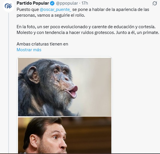 No tardó en llegar la réplica infantil del PP que el mismo día publicó en la cuenta oficial del partido una imagen yuxtaponiendo a un chimpancé con el propio Óscar Puente. El texto que acompañaba la imagen rezaba: «Puesto que Óscar Puente
