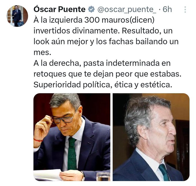 El detonante de esta deplorable cadena de eventos fue un tuit del ministro de Transportes, Óscar Puente publicado este jueves (aniversario del día en que conocimos todos la enorme dimensión de la tragedia de Valencia). En el tuit, Puente se mofó de la oposición con un comentario cargado de sarcasmo, afirmando: «a la izquierda 300 mauros (dicen) invertidos divinamente. Resultado, un look aún mejor y los fachas bailando un mes. A la derecha, pasta indeterminada en retoques que te dejan peor que estabas. Superioridad política, ética y estética.» Acompañó el texto con imágenes de Sánchez con las puñeteras gafas y de Feijóo con la cara retocada. Este ataque persona abrió la puerta a una escalada de vulgaridad, ignorando por completo el contexto de dolor nacional.