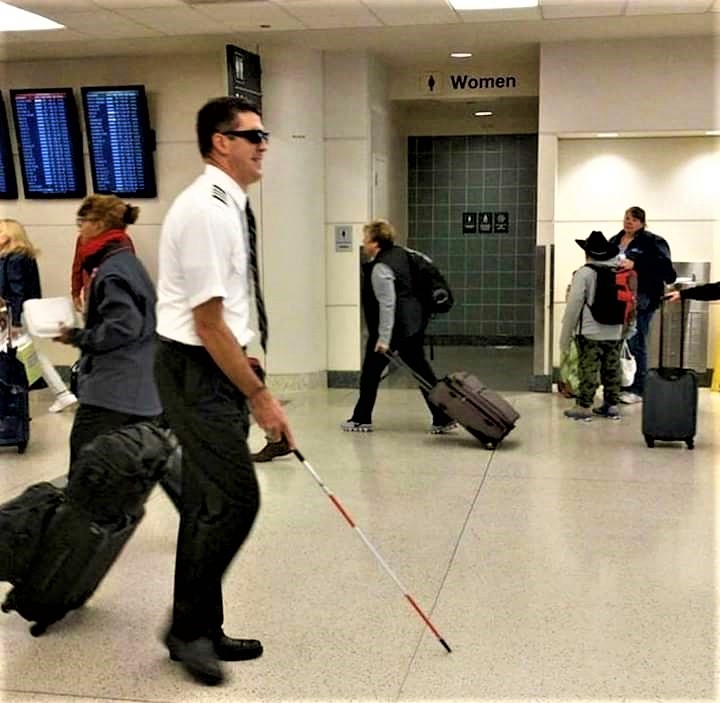 Están todos los pasajeros en la sala de embarque del aeropuerto esperando la salida del vuelo cuando de repente llega el copiloto impecablemente uniformado con anteojos oscuros y un bastón blanco tanteando el camino…