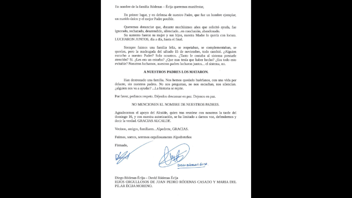 El manifiesto, que ha sido compartido miles de veces y ha generado un torbellino de reacciones en redes, pinta un retrato demoledor de negligencia institucional. Los hermanos relatan cómo su padre, un hombre que luchó «día a día» junto a su esposa por el bienestar familiar, solicitó ayuda durante «muchísimos años» ante un sistema que lo ignoró, rechazó y silenció, probablemente por una enfermedad mental. «Fuimos una familia feliz, estable, complementaria», escriben, cuestionando si merecían ser tratados como un «estorbo». Culpan directamente al «sistema» de haber «matado» a sus padres, dejando a dos huérfanos con «una vida por delante» en un limbo de silencio oficial. Agradecen al alcalde de Alpedrete por darles voz en las noches del 16 y 17 de noviembre, pero su mensaje central es un ruego por privacidad: no conviertan esta herida abierta en munición política. «Somos, fuimos y seremos orgullosamente alpedreteños», concluyen, un cierre que destila fatiga ante el escrutinio público.