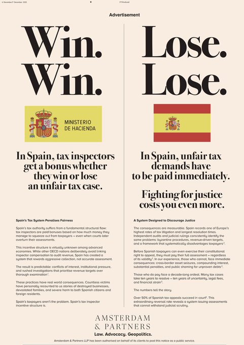 Este fin de semana, el prestigioso ‘Financial Times’ ha dedicado una página completa a un anuncio que ha encendido las alarmas en los círculos financieros y políticos españoles. Bajo el titular «Win. Win.» en un lado y «Lose. Lose.» en el otro, el mensaje acusa directamente al Ministerio de Hacienda de España de fomentar un sistema fiscal «diseñado para penalizar a los contribuyentes con inspecciones injustas». El anuncio, pagado por el bufete internacional Amsterdam & Partners LLP, forma parte de una campaña más amplia que tacha a los inspectores fiscales españoles de «carteristas» y advierte a los inversores extranjeros sobre los riesgos de operar en el país.