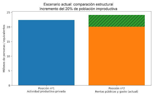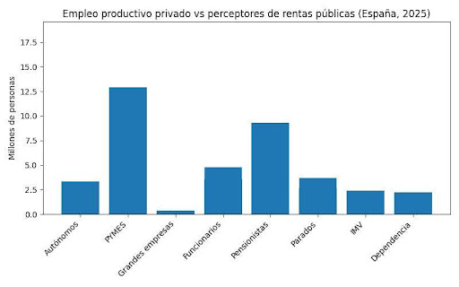 España ha entrado en una fase avanzada de desequilibrio estructural: el volumen de población que consume renta pública supera al de quienes generan ingresos reales en el sector privado. Este fenómeno no es coyuntural, ni consecuencia exclusiva de crisis externas, sino el resultado acumulado de decisiones regulatorias, fiscales, energéticas e industriales que han erosionado de forma sistemática la base productiva nacional.