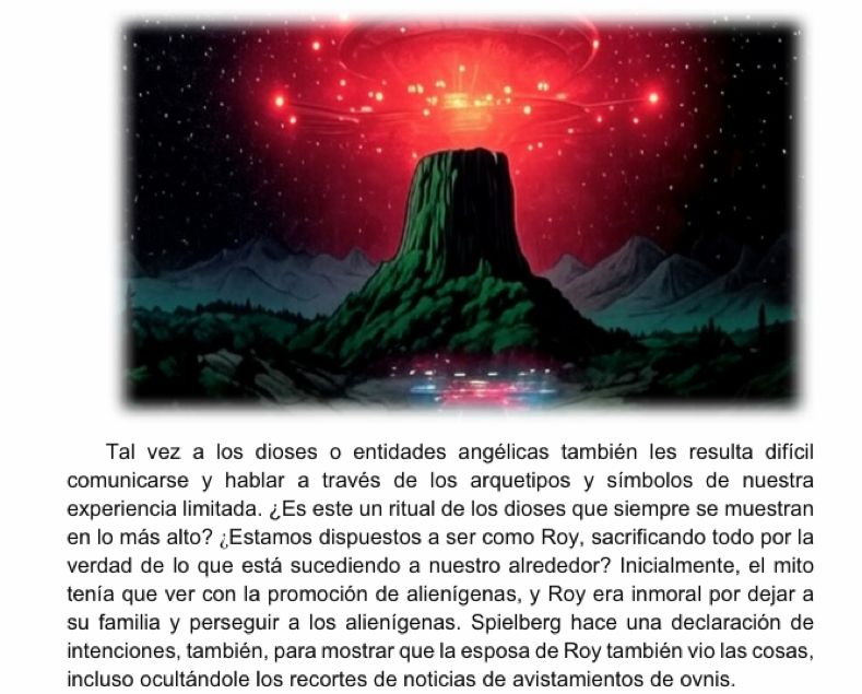 • Símbolos y Comunicación: o Música (las cinco notas): La secuencia musical de cinco tonos (Mi, Sol, Fa, Do, Sol) sirve como el lenguaje universal para la comunicación entre humanos y extraterrestres. Simboliza la búsqueda de un entendimiento que trasciende las barreras del lenguaje humano. o Imágenes mentales: Los personajes Roy Neary y Jillian Guiler reciben visiones telepáticas e intuitivas de la montaña, lo que sugiere clarividencia y telepatía como métodos de comunicación psíquica.