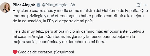Este martes Pilar Alegría ha anunciado su salida del Gobierno de España tras cuatro años y medio como ministra de Educación, Formación Profesional y Deportes, y portavoz del Ejecutivo. En un tuit cargado de autocomplacencia, declaraba: «Hoy cierro cuatro años y medio como ministra del Gobierno de España. Qué enorme privilegio y qué eterno orgullo haber podido contribuir a la mejora de la educación, la FP y el deporte de mi país. He sido muy feliz, pero ahora inicio mi camino más emocionante: vuelvo a mi casa, a Aragón». Con todas las ganas y la fuerza para trabajar en la mejora social, económica y de derechos en mi tierra. Gracias de corazón. ¡Seguimos!»