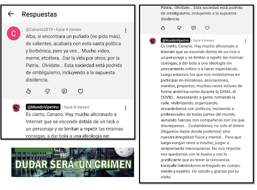 «Alba, si encontrara un puñado (no pido más), de valientes, acabaría con esta casta política y borbónica, pero ya ves… Mucho vídeo, meme, etcétera… Dar la vida por otros, por la Patria… Olvídate… Esta sociedad está podrida de ombliguismo, incluyendo a la supuesta disidencia.»