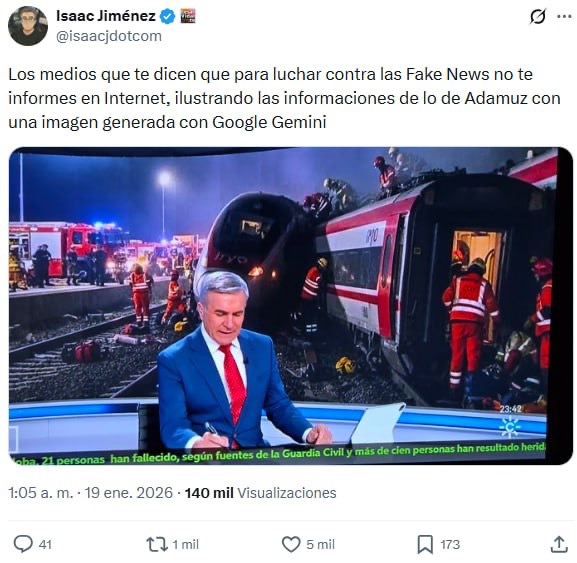 Los medios que te dicen que para luchar contra las Fake News no te informes en Internet, ilustrando las informaciones de lo de Adamuz con una imagen creada con Google Gemini.