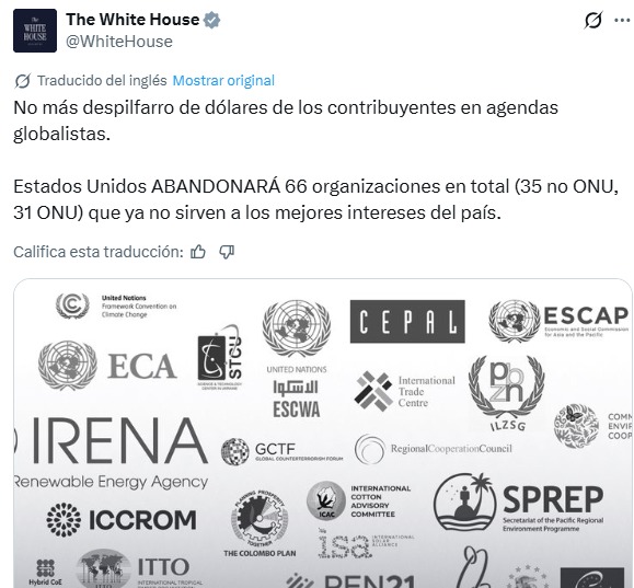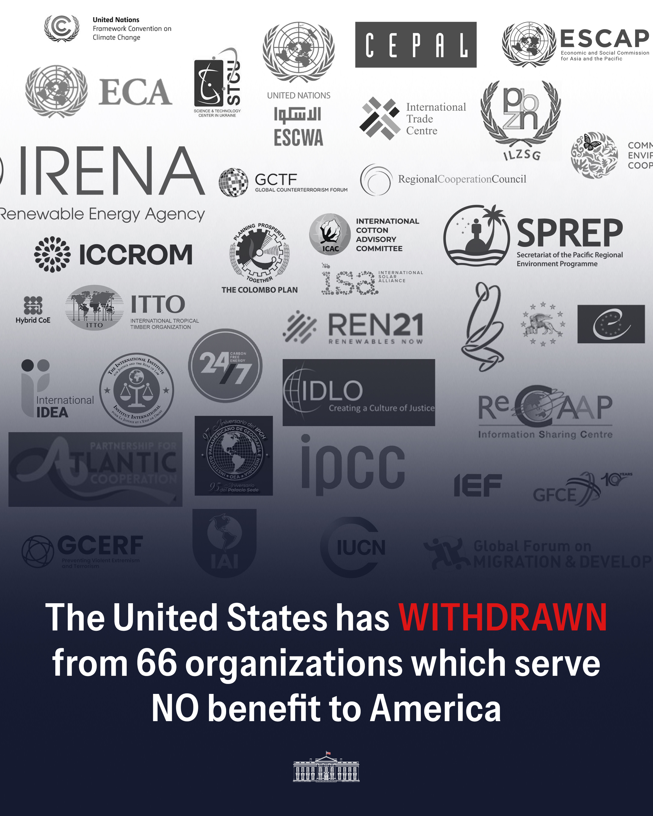 «No más despilfarro de dólares de los contribuyentes en agendas globalistas. Estados Unidos ABANDONARÁ 66 organizaciones en total (35 no ONU, 31 ONU) que ya no sirven a los mejores intereses del país.»