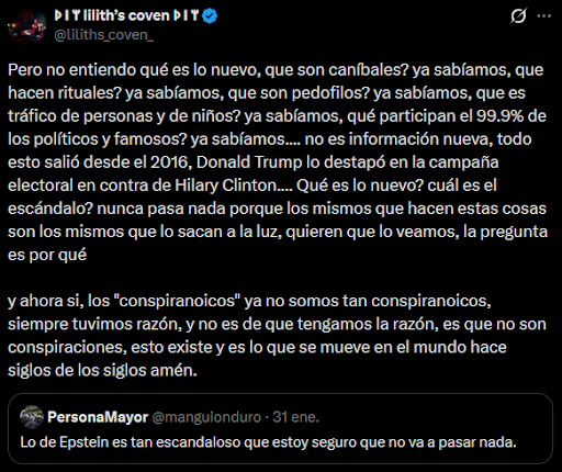 NOTA: Las cuentas de X aquí citadas se mencionan con fines informativos y de análisis, sin intención de desacreditar a sus autores ni de calificarlas como promotoras de teorías conspirativas. Se busca señalar ideas y matices, no personas, ya que los contenidos expuestos se basan en documentación publicada y verificable, por lo que los citados no deben considerarse aludidos.