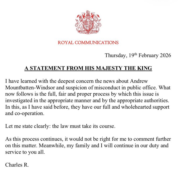 Esto es lo que dice el comunicado: « He recibido con la más profunda preocupación las noticias sobre Andrew Mountbatten-Windsor y la sospecha de conducta indebida en un cargo público. Lo que sigue ahora es el proceso completo, justo y adecuado mediante el cual este asunto se investiga de la manera apropiada y por las autoridades correspondientes. En esto, como he dicho antes, cuentan con nuestro apoyo y cooperación totales y de todo corazón. Permítanme declarar claramente: la ley debe seguir su curso. Mientras este proceso continúa, no sería correcto que yo comente más sobre este asunto. Mientras tanto, mi familia y yo continuaremos con nuestro deber y servicio hacia todos ustedes. Charles R.»