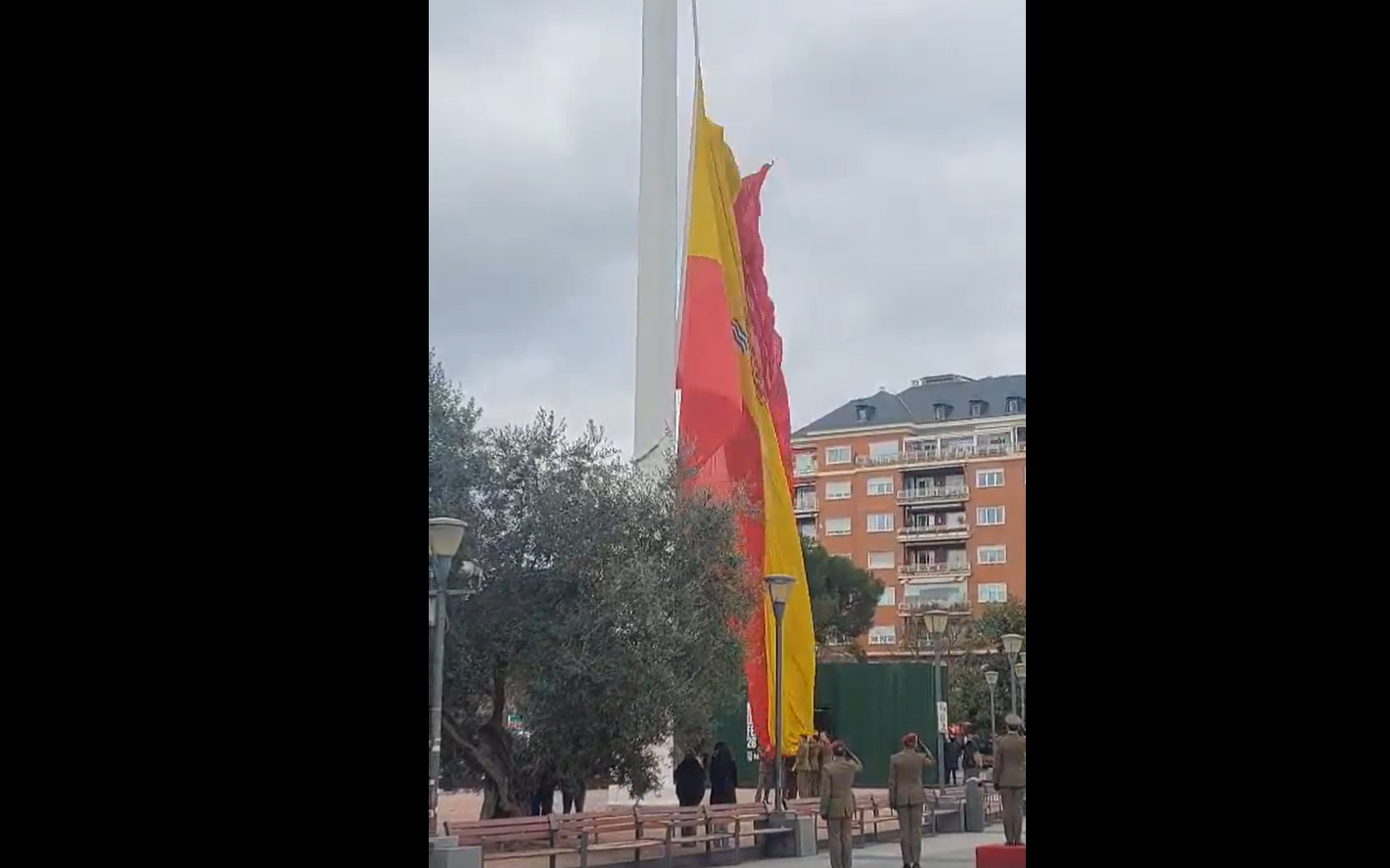 En una mañana gris y ventosa, la Plaza de Colón en Madrid se ha convertido en el escenario de un espectáculo que, más allá de lo anecdótico, parece una alegoría perfecta de la realidad nacional. Durante la ceremonia de izado de la bandera española –esa colosal enseña que ondea sobre uno de los monumentos más emblemáticos de la capital–, el viento ha azotado con furia, rasgando el tejido rojo y gualda en jirones que cayeron al suelo como hojas muertas. La bandera, recién reemplazada y supuestamente en perfectas condiciones, no resistió el embate y se desintegró ante los ojos atónitos de los militares presentes y un puñado de espectadores. Un mal presagio, como lo calificó un usuario en X, que las autoridades, fieles a su estilo, podrían atribuir al «cambio climático» para eludir responsabilidades.