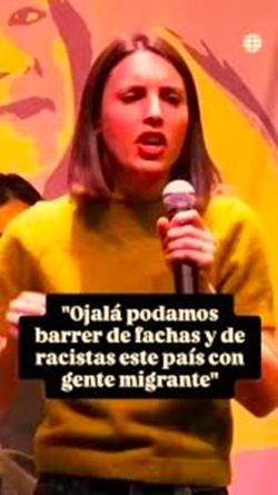 Con tanto escándalo entre los mejores y avanzados próceres del aparato del estado borbónico no se ha dado toda la importancia que merecen a las barbaridades proferidas por la energúmena Irene Montero, la fanática ex concubina de Pablo Iglesias. Me refiero a su escandalosa confesión de pretender sustituir a la población europea por otra más a su gusto que es precisamente el del Gran Capital al que obedece. Confiesa la voluntad de perpetrar el Reemplazo, dogma criminal WOKE. Sin embargo, hay que agradecerle su sinceridad que se supone resultado de su estulticia, degeneración o sectarismo. Una confesión que le debiera quitar la máscara y dejarla en puritos cueros ante sus menguantes seguidores por muy desavisados, topos e ineptos que demuestren ser.