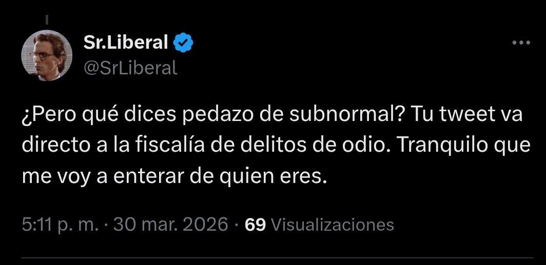 Divertida polémica del Sr Liberal de Twitter, famoso por sus denuncias por delito de odio, en la red que le ha hecho famoso por (así se afirma desde muchos foros patriotas) estarse chivando constantemente de quien no piensa como él de su amado sionismo. Un grupo patriota lo acusó públicamente de chivato y él, de forma inmediata, dio la razón a estas personas al amenazarles con ir de inmediato a nuestra querida fiscalía del odio. Ésa que tanto se esfuerza cada día, como ocurrió con este que os escribe (me pidieron 5 años y 10.000 euros por una auténtica parida), en perseguir a cualquiera que muestre odio (así lo llaman ellos) contra cualquier persona, institución o ideal que no se corresponda con la mayoría de europeos currantes, cristianos y patriotas. Una institución con la que el Sr Liberal (así lo manifiesta él mismo) parece sentirse muy a gustito.