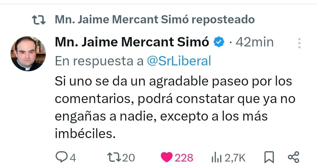 Por lo tanto, no estamos diciendo nada raro ni metiéndonos con él, sino al contrario: al Sr Liberal le encanta la fiscalía del odio: el instrumento más antinacional y censurador del Régimen zapateril contra el que este personaje dice luchar cada día. A la polémica se unió, incluso, un famoso cura patriota y antibolchevique (algo rarísimo hoy en día), quien le recordó (con toda la educación del mundo) a este señor que cada vez menos gente le ríe la gracia. Y tampoco me extraña, con la que está cayendo.