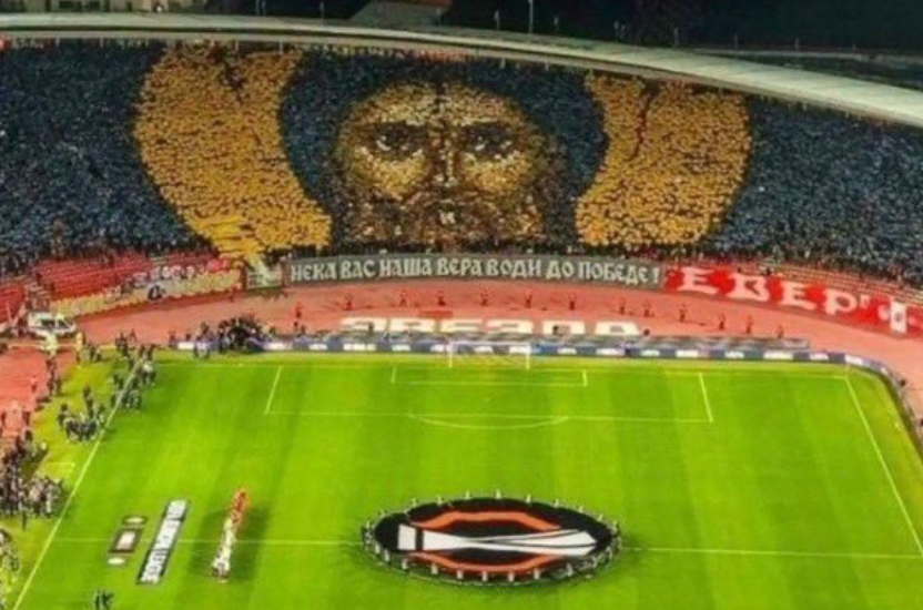El caso es escandaloso. El pasado 26 de febrero, en el partido de repesca de la Europa League entre el Estrella Roja de Belgrado y el Lille francés, la grada del Estadio Rajko Mitić se convirtió en un mosaico imponente: la imagen de San Simeón (Sveti Simeon), fundador del Estado serbio medieval y santo ortodoxo, acompañada de la leyenda “Que nuestra fe os guíe hasta la victoria”.