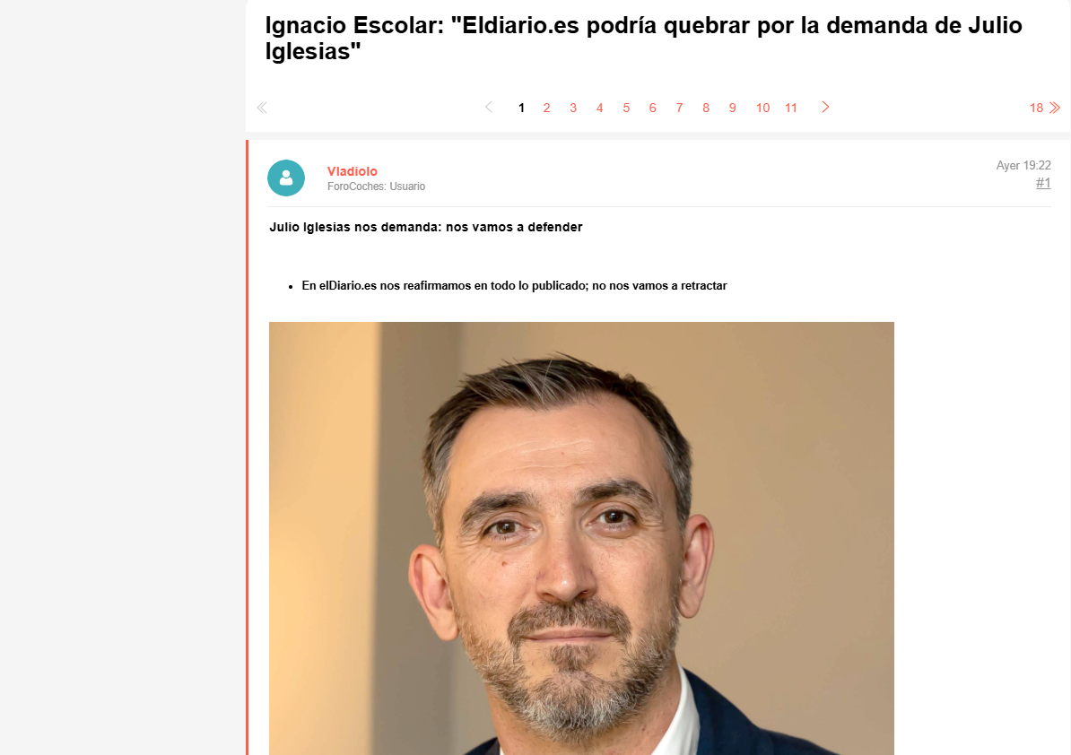 En un hilo reciente del foro Forocoches, titulado Ignacio Escolar: «Eldiario.es podría quebrar por la demanda de Julio Iglesias», los usuarios han debatido y comentado sobre la situación legal que enfrenta el medio digital eldiario.es tras una demanda presentada por el cantante Julio Iglesias. El post original reproduce un artículo escrito por Ignacio Escolar, director de eldiario.es, publicado el 3 de marzo de 2026 y actualizado al día siguiente. En él, Escolar detalla las implicaciones de esta acción judicial, que podría llevar al cierre del periódico. A continuación, se resume toda la información extraída del hilo, incluyendo el contenido principal y las opiniones de los participantes.