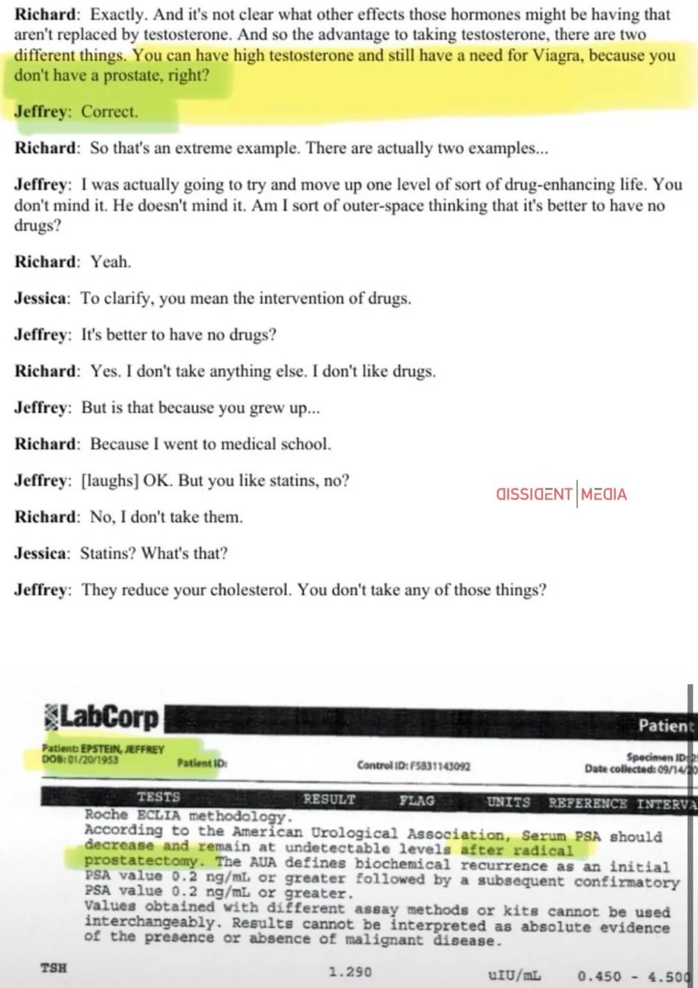 Uno de los puntos más destacados es el estado de la próstata. El informe oficial de la Jefa de Medicina Forense de Nueva York describe el cadáver examinado como poseedor de una próstata ligeramente agrandada y difusa, un hallazgo habitual en hombres de avanzada edad y que indica que el órgano estaba presente e intacto. En contraste, la historia clínica privada de Epstein —documentada en múltiples fuentes dentro de los archivos— confirma que había sido sometido a una prostatectomía radical años antes de su detención. Se mencionan niveles de PSA interpretados en el contexto de la ausencia total de la glándula, expectativas postoperatorias y comunicaciones directas que confirman la extirpación quirúrgica. Una próstata removida deja cicatrices, ausencia del órgano o evidencias quirúrgicas claras; no puede aparecer agrandada e intacta en una autopsia. Esta discrepancia excluye que el cuerpo analizado el 11 de agosto de 2019 fuera el de Jeffrey Epstein.