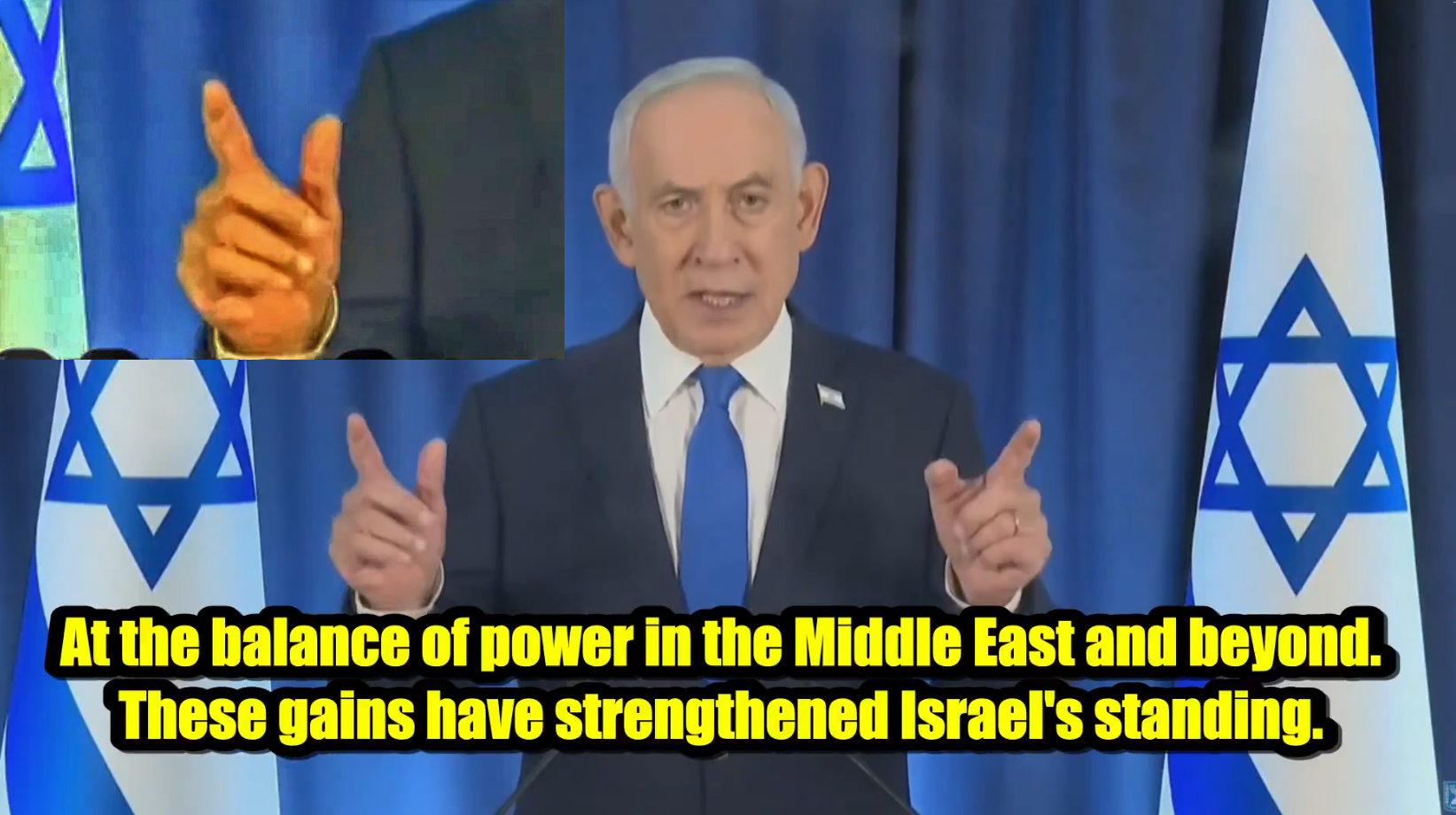 Un post de X publicado por la cuenta @WilliamRamseyIn ha generado una oleada de especulaciones y todo tipo de teorías en las últimas horas. En él se comparte un fragmento de un discurso o conferencia de prensa de Benjamin Netanyahu, primer ministro de Israel, donde aparece con las manos levantadas en varias ocasiones frente a banderas israelíes.