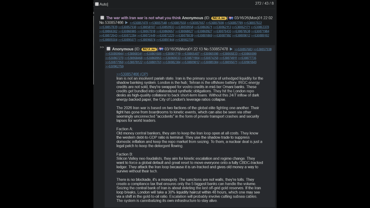 Un post anónimo publicado en 4chan el 16 de marzo de 2026 ha viralizado en redes sociales tras ser compartido por la cuenta @TheDefiantGhost en X (antes Twitter). El mensaje, titulado “The war with Iran is not what you think” (La guerra con Irán no es lo que crees), afirma que el conflicto de 2026 no responde a razones geopolíticas o nucleares oficiales, sino a una guerra interna entre dos facciones de la élite global por el control de un sistema financiero paralelo.