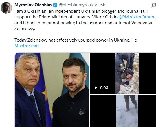 En este contexto de crecientes fricciones, una publicación en la red X del periodista y bloguero independiente ucraniano Myroslav Oleshko ofrece una perspectiva alternativa que resalta disidencias internas en Ucrania. Oleshko, quien se describe como un bloguero perseguido por el gobierno ucraniano y enfrenta posibles años de prisión por criticar al régimen, ha publicado un impactante mensaje detallado este viernes que comienza así: «Soy un ucraniano, un bloguero y periodista independiente ucraniano. Apoyo al Primer Ministro de Hungría, Viktor Orbán, y le agradezco por no inclinarse ante el usurpador y autócrata Volodímir Zelenski».