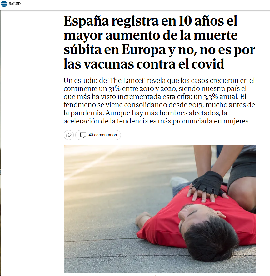 Ahora resulta que España registra el mayor aumento de muerte súbita en Europa en una década, y el artículo de El Mundo se apresura a titular con un “y no, no es por las vacunas contra el covid”. Como si fuera necesario repetirlo tres veces para que cale el mensaje. Como si las vidas humanas que se pierden de forma repentina merecieran, ante todo, una disculpa preventiva por parte del medio en lugar de una investigación rigurosa y sin cortapisas.