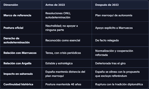 - Después de 03-2022, España abandona la neutralidad y respalda el plan marroquí, lo que supone un cambio histórico en su política exterior y en su relación con el conflicto saharaui.